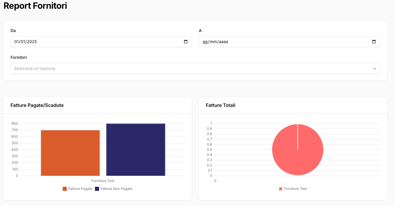 Il report fornitori ti permette di filtrare i dati per periodo o per singolo fornitore per analizzare meglio le spese.
